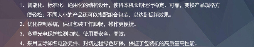 拥有多项专利技术 数千平标准厂房 批量标准化生产 可定制开发和自动化流水线搭建! 超前技术团队 先进加工工艺 高精度加工设备 近20年专业研发经验不断改进、创新、突破!我们定位于专注做中高端全自动热收缩膜包装机,请不要拿我们和不同定位的厂家对比!我们是源头工厂…